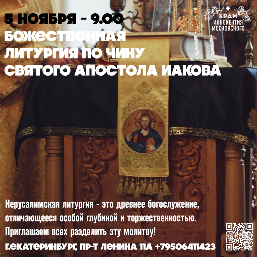 5 ноября, в день памяти апостола Иакова, брата Господня, приглашаем на Божественную Литургия по чину святого апостола Иакова.
