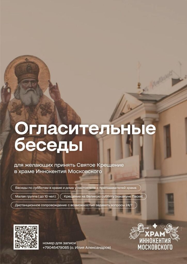 Мы приглашаем желающих принять святое крещение в храме Иннокентия Московского на огласительные беседы которые пройдут в нашем домашнем пространстве на пр-те Ленина 11а и дома у настоятеля и учителей церкви, само крещение совершим на Великую субботу (накануне Пасхи). Так же предлагаем дистанционное сопровождение с возможностью задавать вопросы 24/7 и малую группу с индивидуальным подходом к каждому (до 10 чел).